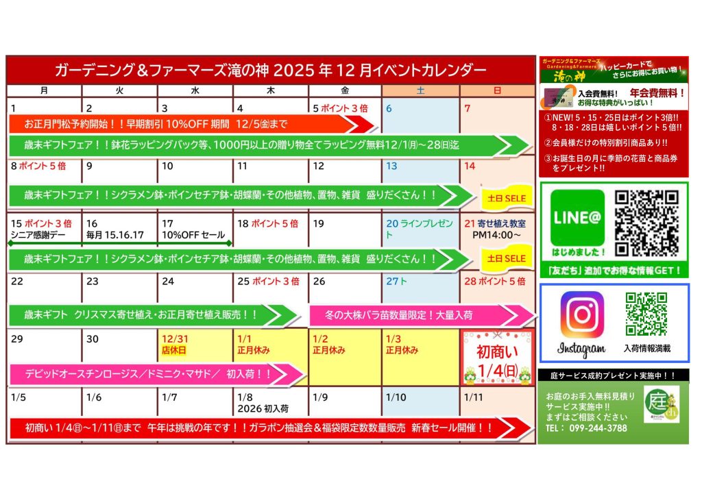 12月イベントカレンダー『年末年始はお花で華やかに!!』 2025/12/01 年末年始を華やかに飾るお花を揃えて、 みなさまのご来店お待ちしております。 ※年末は12/30㈫まで営業いたします。 ※初商いは1/4㈰より通常営業となります。